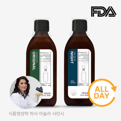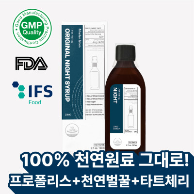 | 원재료명 및 함량 | 데이시럽: 주원료-글루콘산아연 1% / 기타원료-오렌지주스 59%, 벌꿀 33%, 프로폴리스 5%, 레몬밤 잎 추출물 2% / 나이트시럽:주원료-글루콘산아연 0.25% / 기타원료-산양벚나무열매주스 59.75%, 벌꿀 35%, 프로폴리스 5% |